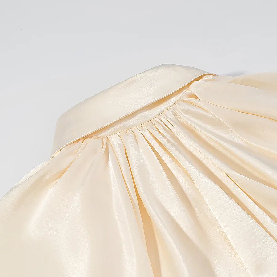 Designed for days that call for grace and movement, this satin zip-up outerwear drapes like liquid light. The voluminous silhouette, shaped by its winged sleeves and subtle sheen, turns every step into a statement.